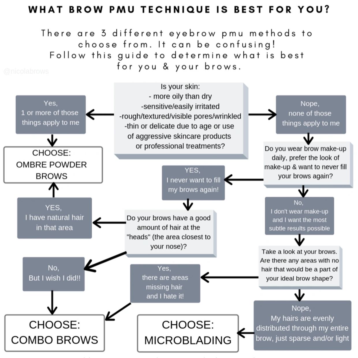 The following diagram is extremely useful in helping determine which brow technique and style is best suited for your skin and brows. Unfortunately, not all skin types are suited for all of the techniques.